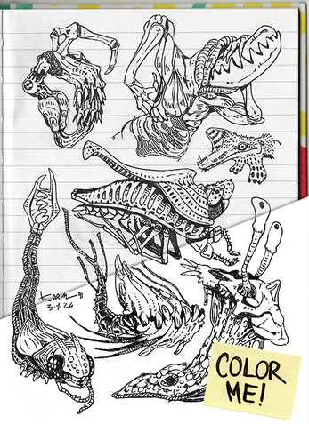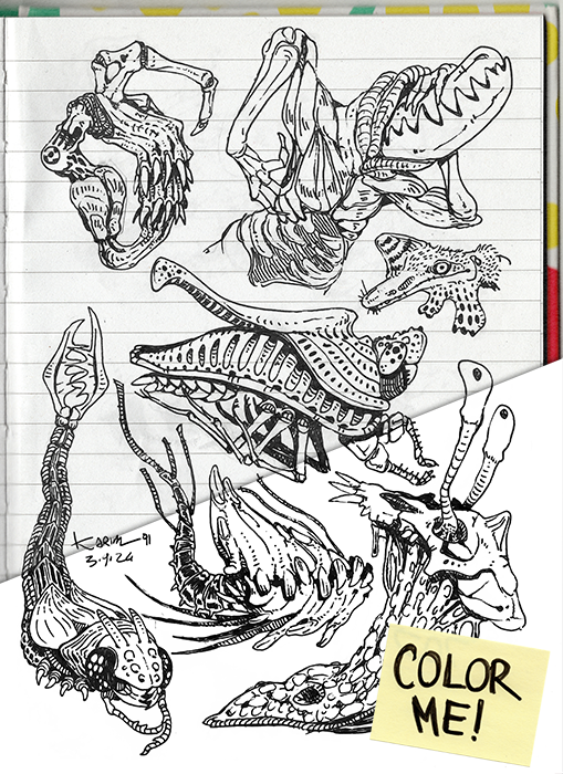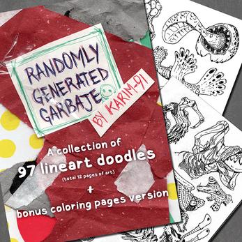 A mini-artbook containing 12 pages of lineart doodles depicting monsters, critters, piles of organs, and some weirdos.